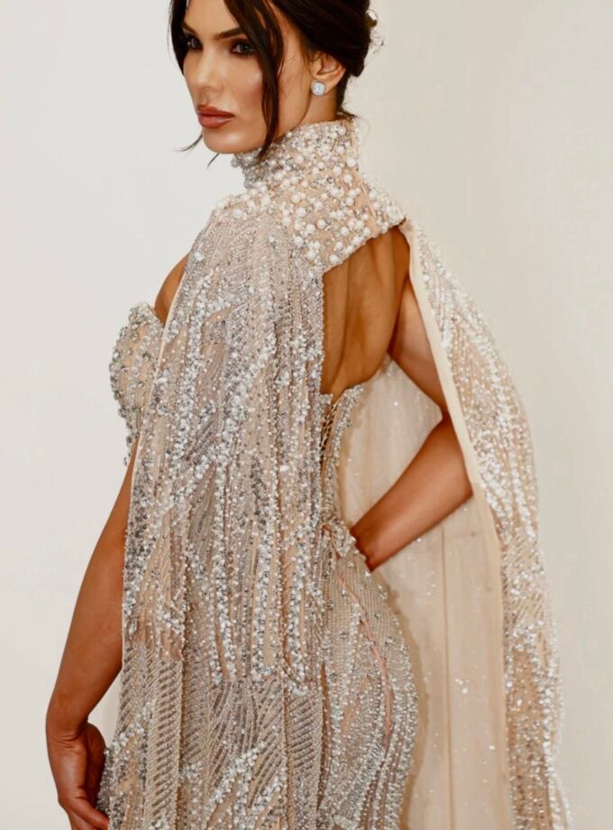 Silver Crystal Beaded Illusion Gown with Detachable Cape Sleeves