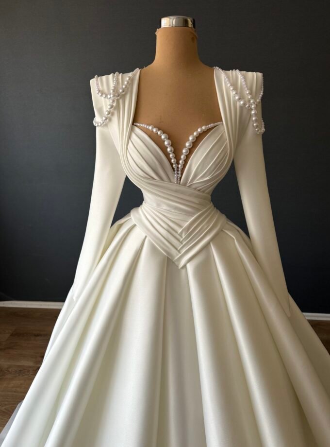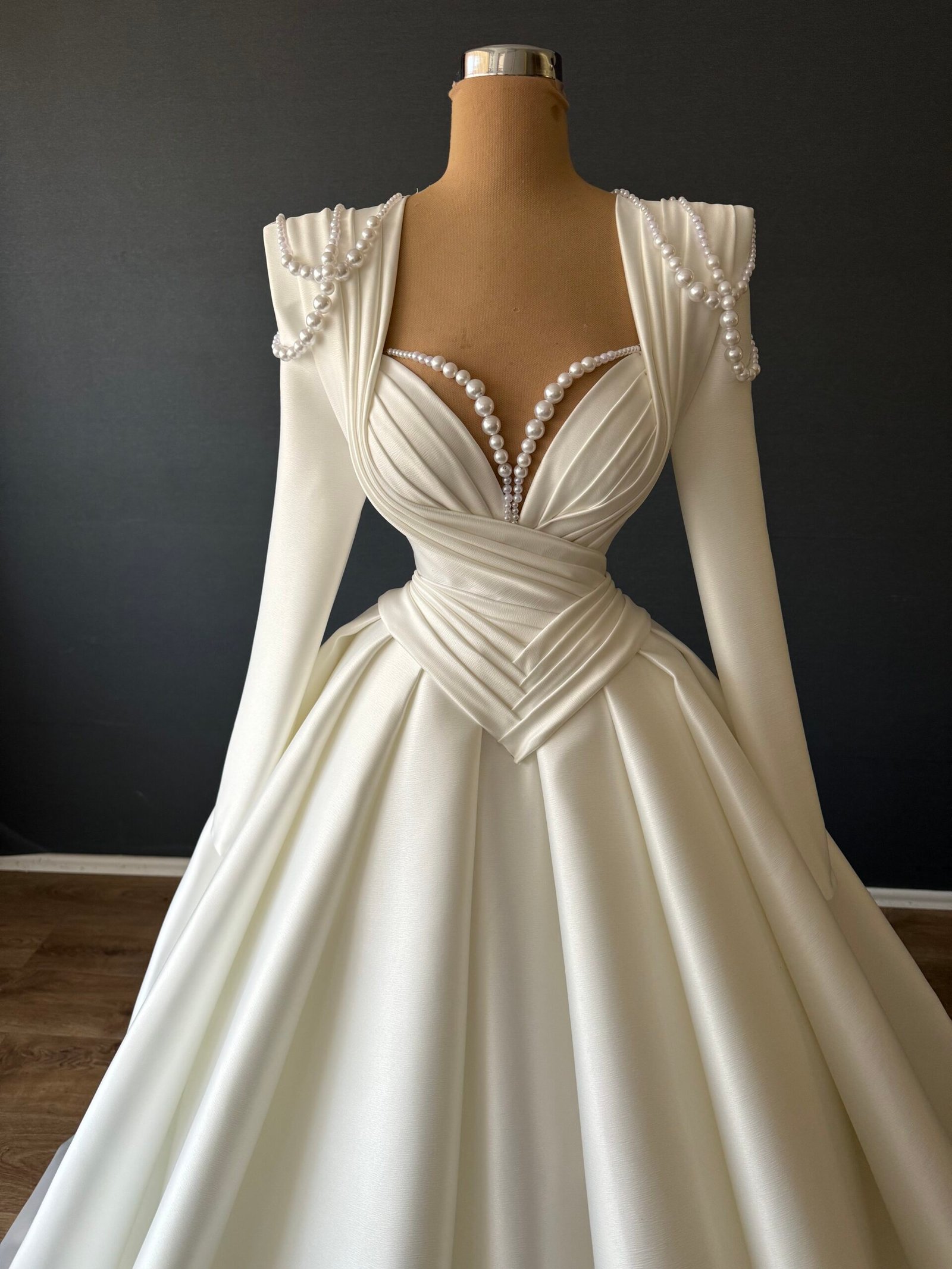 Ivory White Satin Ball Gown – Structured Shoulder Long Sleeve Bridal Dress