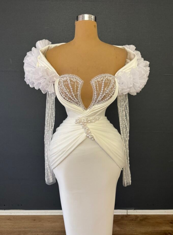 Ivory Satin Draped Off-the-Shoulder Formal Gown – Pearl Neckline Dress