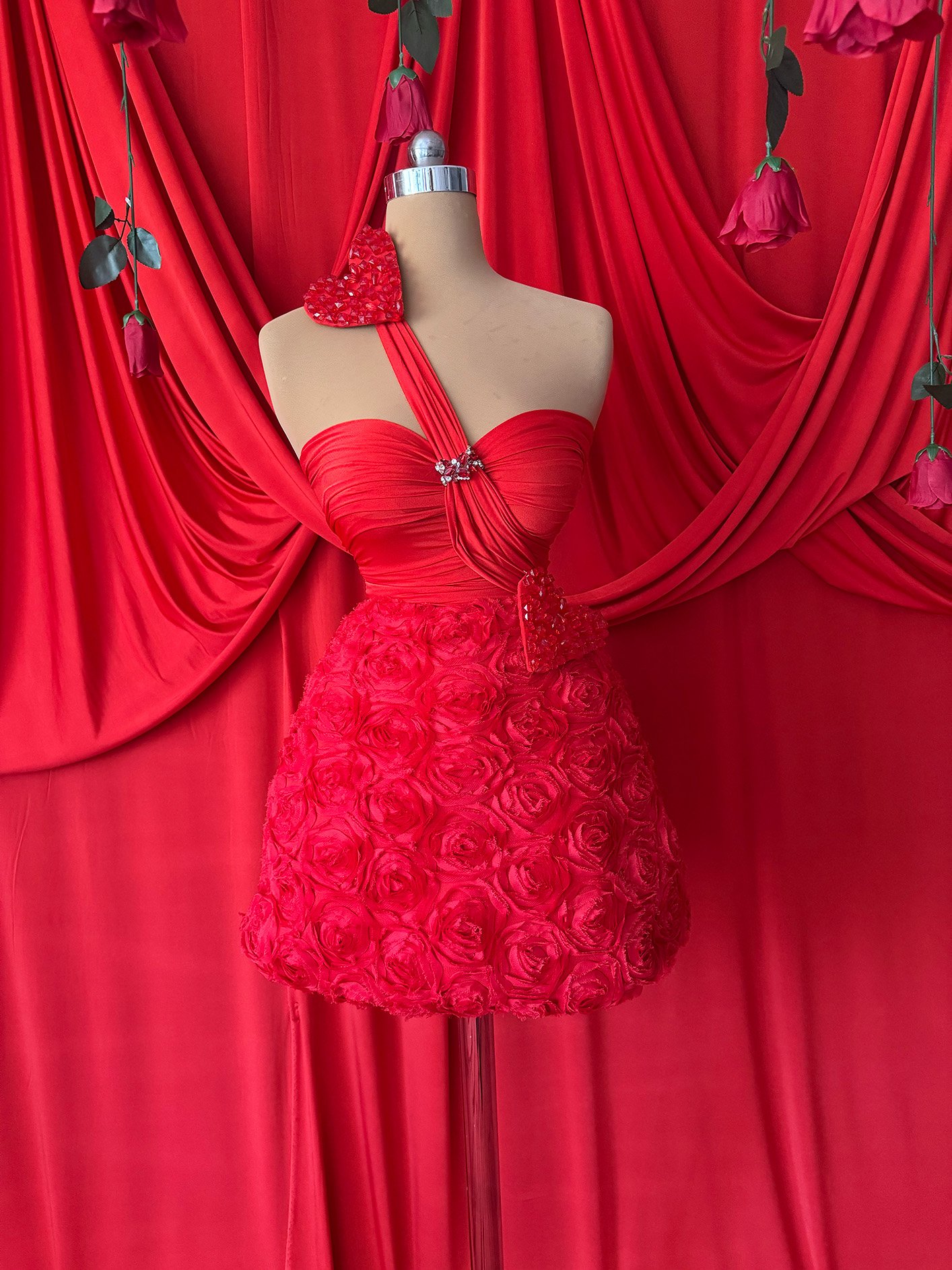 Red Rosette Skirt Mini Dress – Heart Rhinestone Halter Party Dress