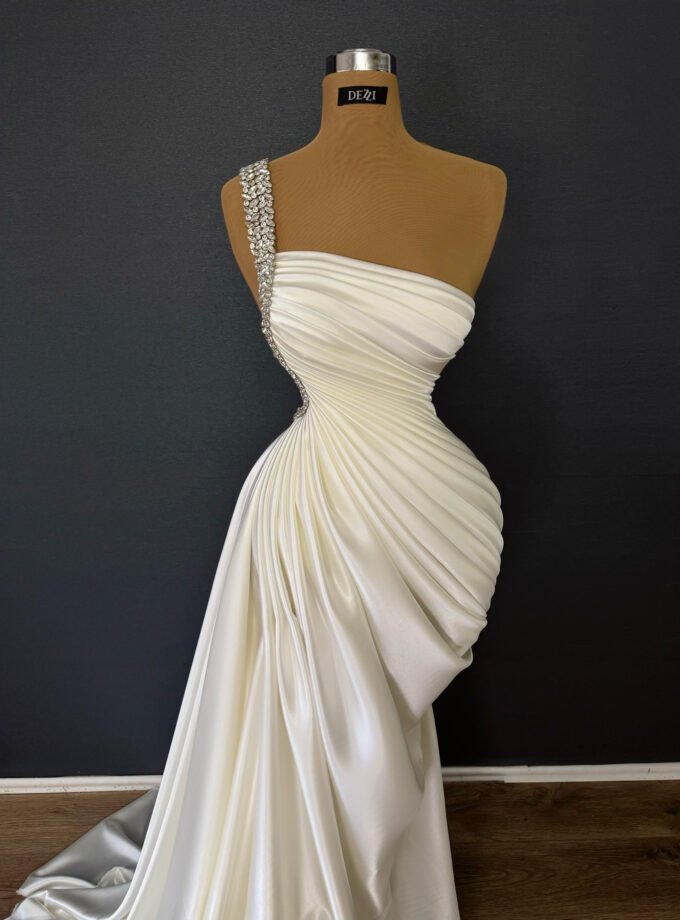 White Draped One-Shoulder Satin Gown – Crystal Strap Wedding Dress