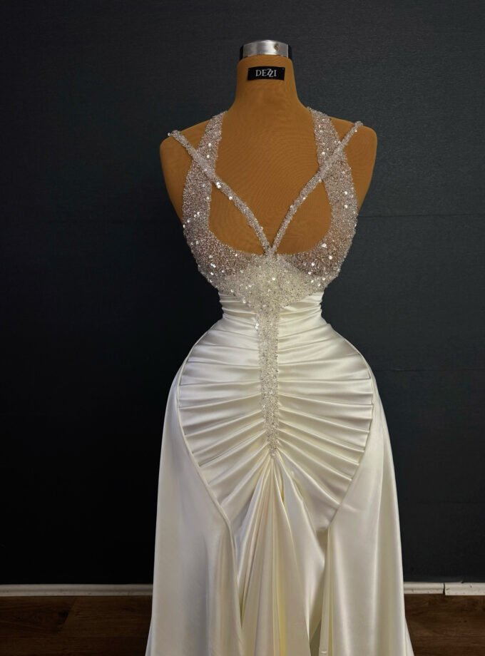 White Crystal Beaded Halter Illusion Wedding Dress – Ruched Satin Skirt