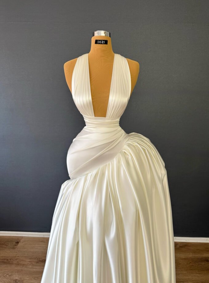 White Plunge Halter Satin Wedding Dress – Sculptural Draped Ball Gown
