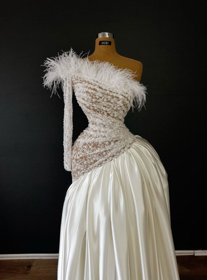 White One-Shoulder Feather Bridal Gown – Lace Illusion Satin Skirt