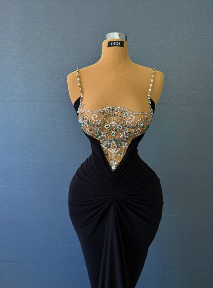 Black Draped Formal Gown – Emerald Jewel Beaded Bodice