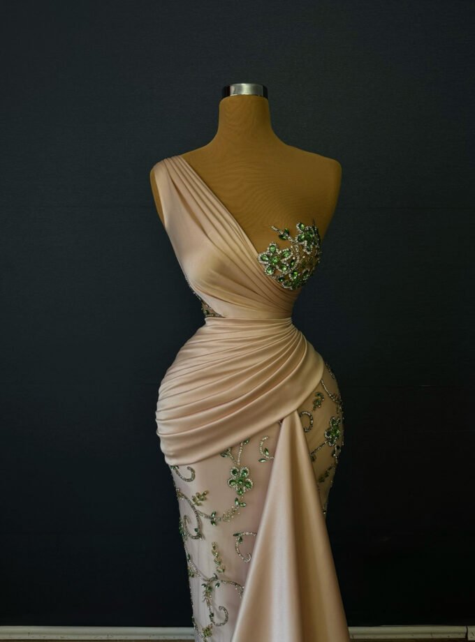 Blush Satin One-Shoulder Gown – Emerald Green Floral Beading