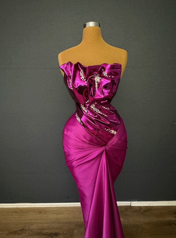 Metallic Magenta Strapless Formal Dress – Sculptural Drape Gown