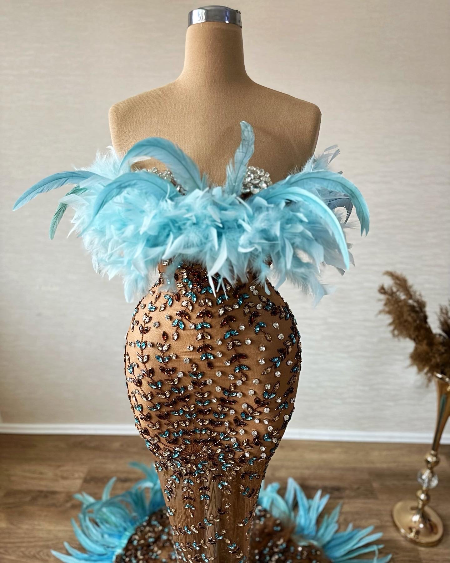 Make a magnificent entrance in this exotic Aqua Feather Beaded Mermaid Gown. This breathtaking formal dress features a figure-hugging, sheer nude illusion bodice that is densely hand-beaded with shimmering brown/gold and aqua crystals, creating a luxurious, sparkling texture. The silhouette is defined by dramatic aqua blue feather trim at the strapless neckline and a full, voluminous circle of feathers at the hemline. Perfect as a pageant gown, gala event dress, or unique, high-end formal wear. Shop this unforgettable beaded feather gown for ultimate couture glamour.