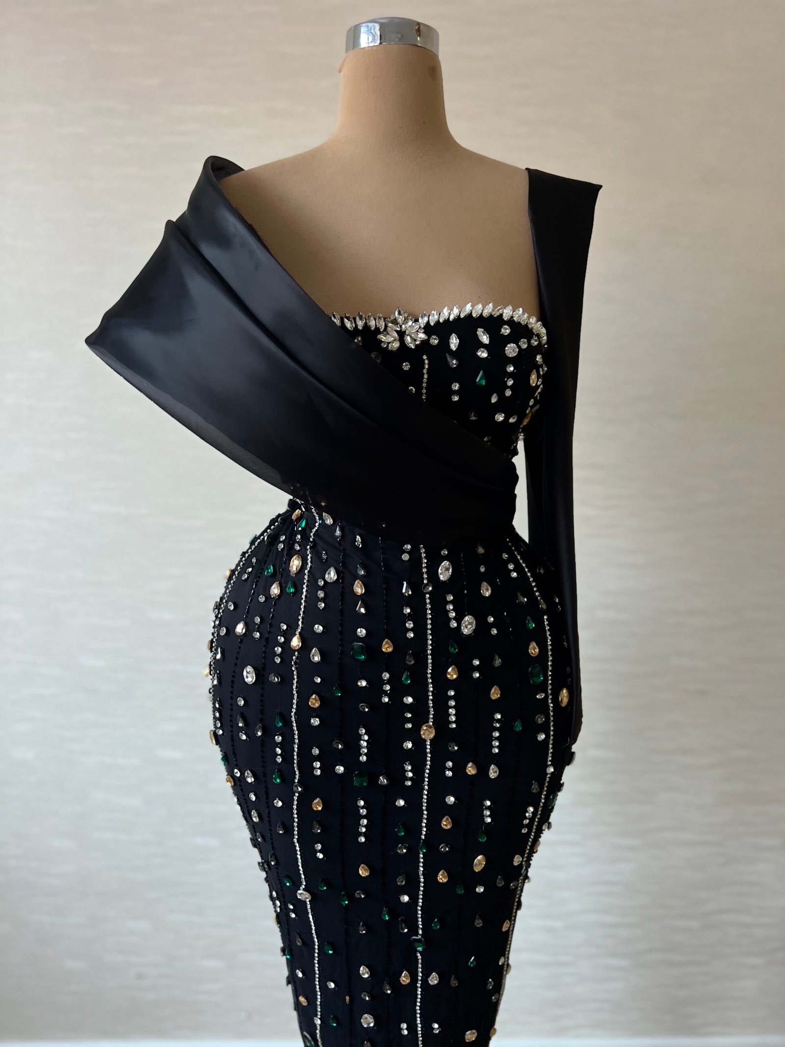 Black Crystal Beaded Formal Gown – Off-the-Shoulder Satin Drape Dress