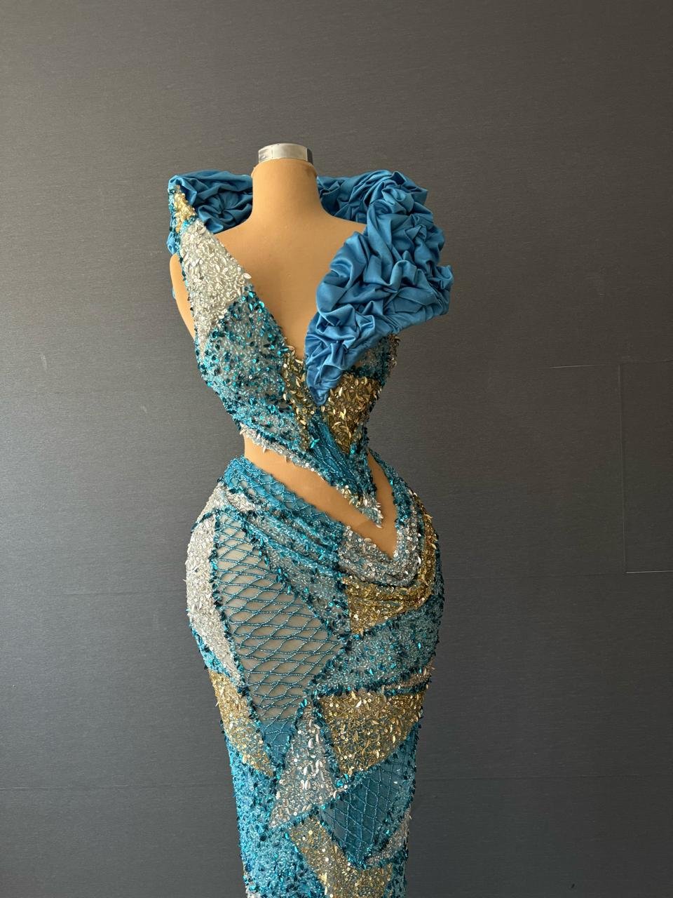 Make a dazzling, artistic entrance in this extraordinary Blue and Gold Crystal Mosaic Gown. This couture dress features an intricate, geometric pattern created by thousands of blue, silver, and gold sequins and crystals over a nude illusion base. The highly structured silhouette is defined by bold waist cutouts and a plunging neckline. The look is completed by a magnificent, voluminous sculptural ruffle collar crafted from blue fabric. Ideal for gala events, red carpet appearances, pageants, or any exclusive black tie occasion demanding extreme, unique style. Shop this unforgettable mosaic beaded gown.