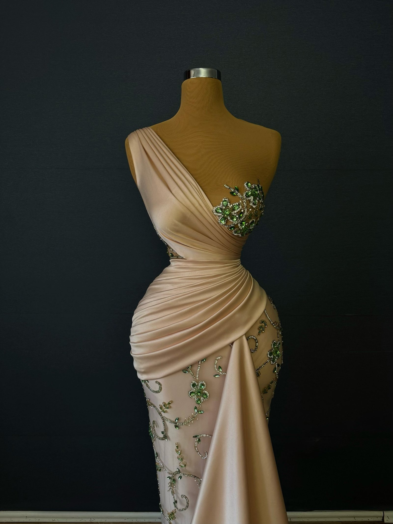 Step out in radiant elegance with this exquisite Blush Satin One-Shoulder Gown. This sophisticated dress features a form-fitting mermaid silhouette crafted from luxurious, soft blush pink satin with elegant asymmetric draping across the bust and waist. The true highlight is the intricate embellishment: the skirt and illusion neckline are adorned with delicate emerald green and crystal floral beading that trails down the leg like beautiful vines. The single-shoulder design and cascading side drape complete this glamorous look. Ideal for gala events, weddings, pageants, and high-end formal occasions. Shop this stunning pink and green beaded evening dress.
