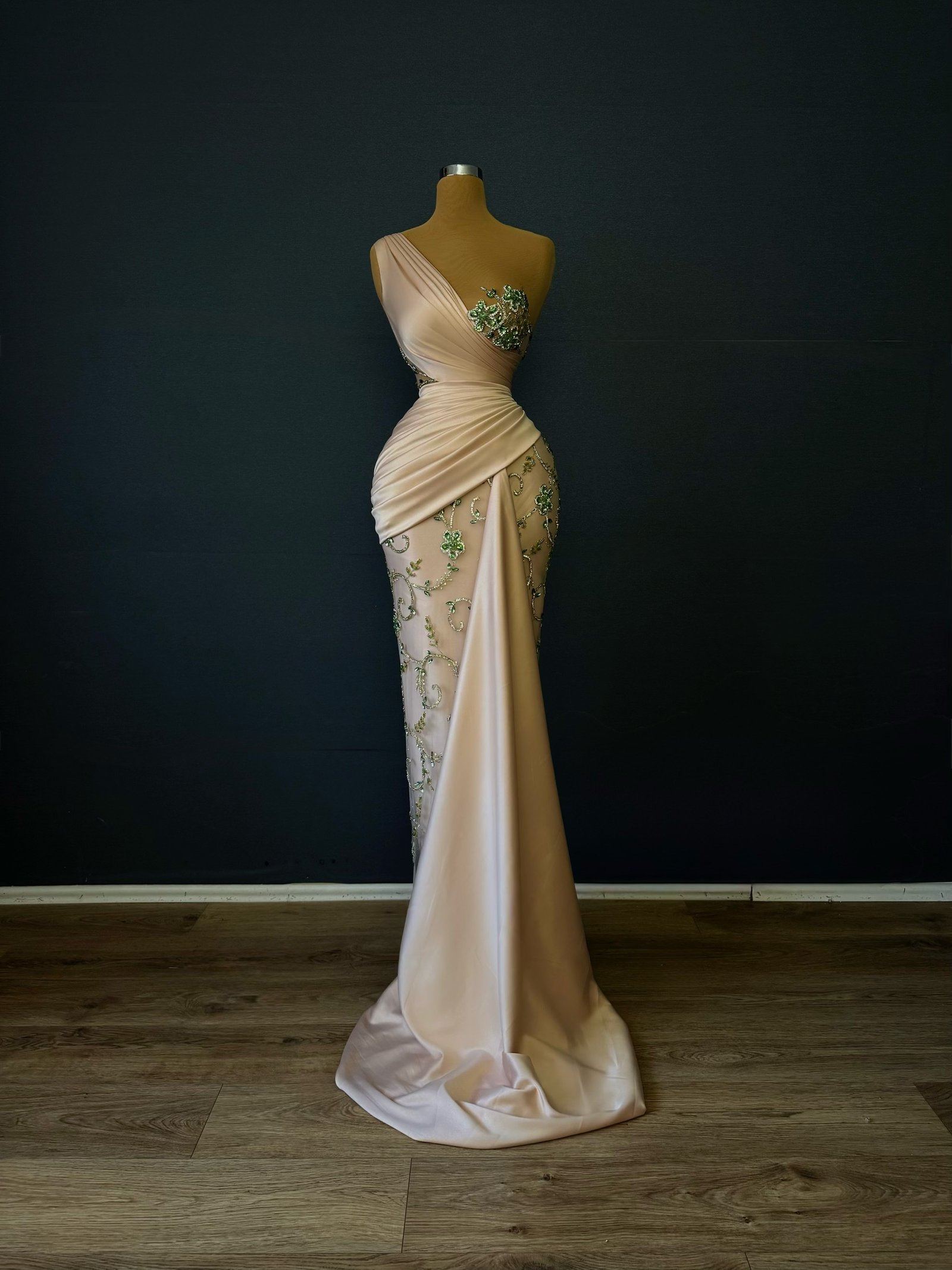 Step out in radiant elegance with this exquisite Blush Satin One-Shoulder Gown. This sophisticated dress features a form-fitting mermaid silhouette crafted from luxurious, soft blush pink satin with elegant asymmetric draping across the bust and waist.