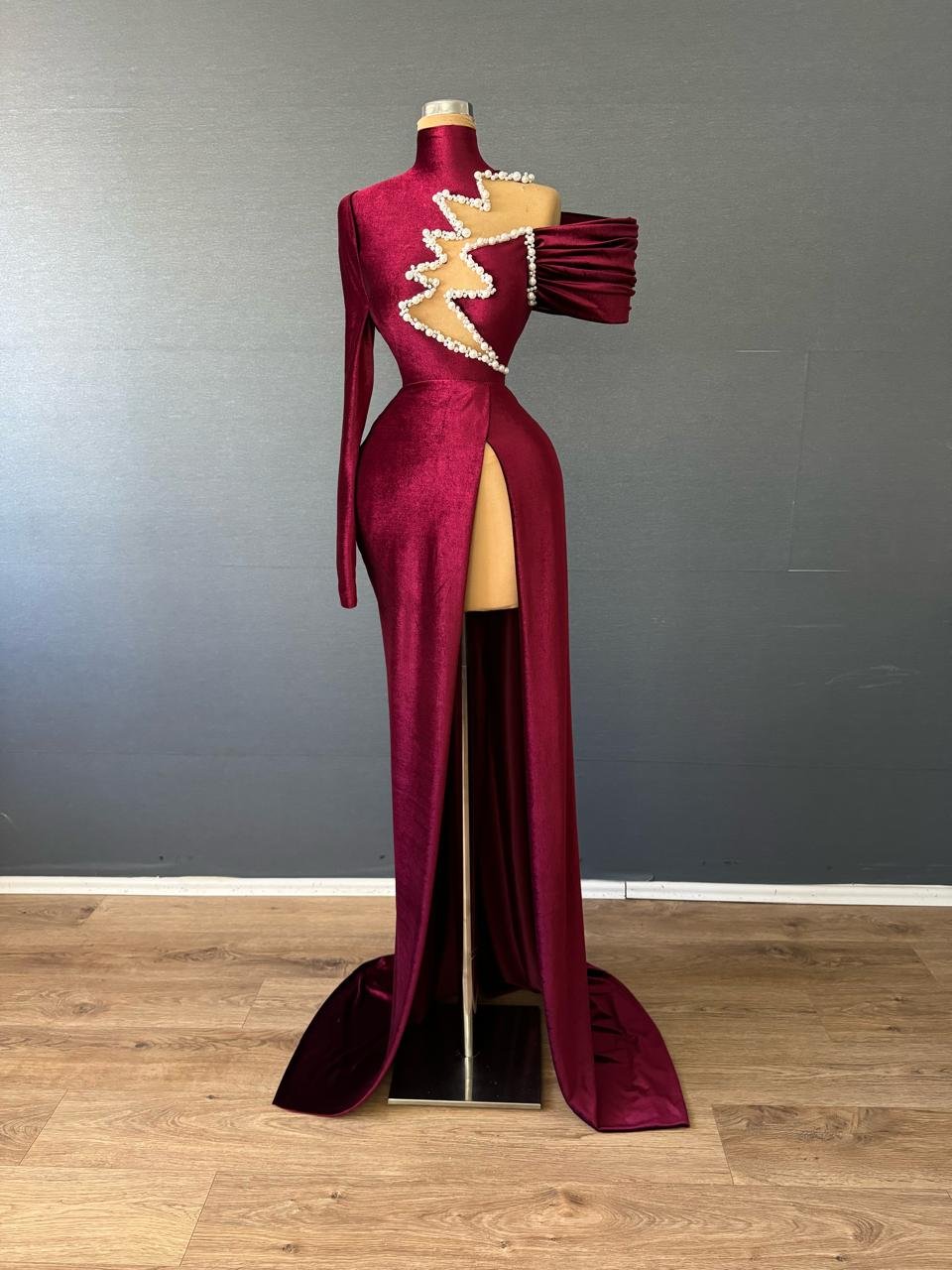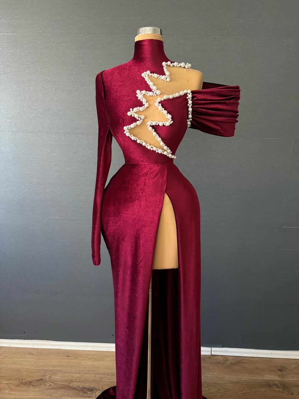Make a powerful and unforgettable entrance in this exclusive Burgundy Velvet High Slit Gown. Crafted from shimmering deep red velvet, this dress features a figure-hugging, structural silhouette. The dramatic high neck transitions into a bold, asymmetrical lightning-bolt cutout across the chest and back, highlighted by sparkling white crystal trim. It includes a tailored long sleeve on one side, a voluminous ruched accent on the other, and a fierce high thigh slit. Perfect for gala events, red carpet appearances, or any exclusive black tie occasion demanding extreme style. Shop this stunning velvet cutout gown for ultimate couture impact.