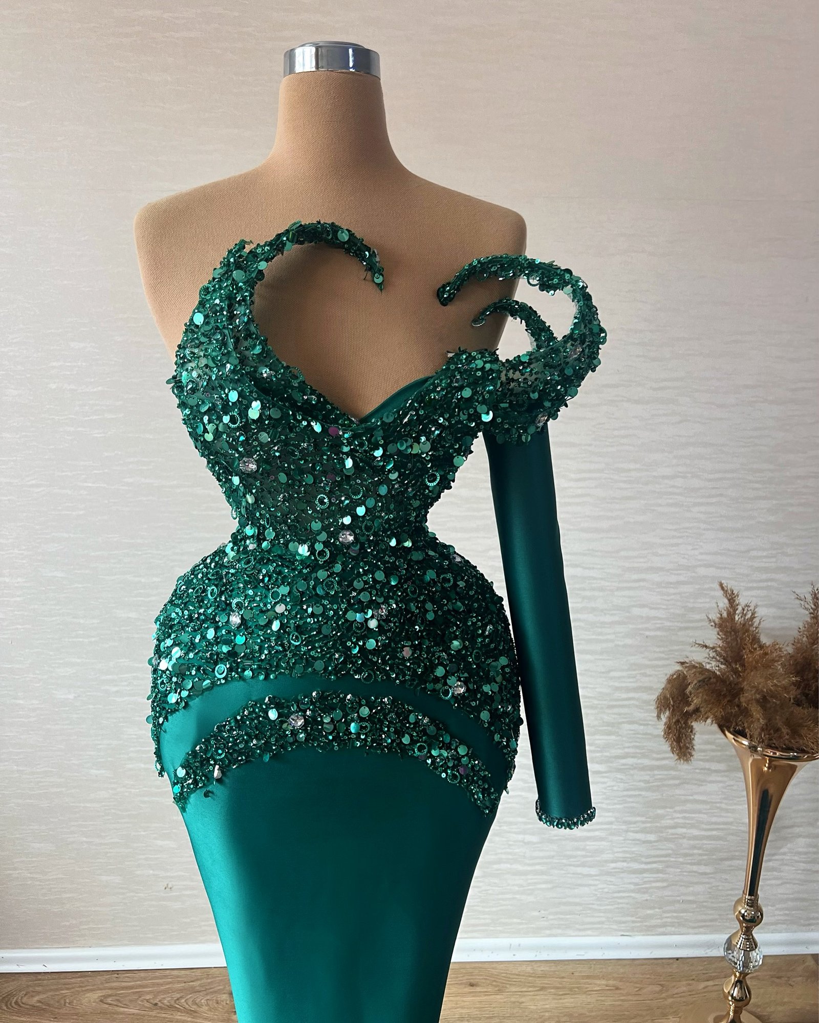 Make a magnificent statement in this extraordinary Emerald Green Sequin Formal Gown. This high-fashion dress features a sleek, figure-hugging green satin skirt and a dramatically structured bodice. The top is covered in dense emerald green sequins and crystals, shaped into a unique sculptural sweetheart neckline that extends into a bold, single long sleeve. The asymmetrical design and intricate embellishment make this gown perfect for gala events, red carpet appearances, pageants, or any exclusive black tie occasion. Shop this unforgettable one-shoulder sequin gown for ultimate couture glamour.