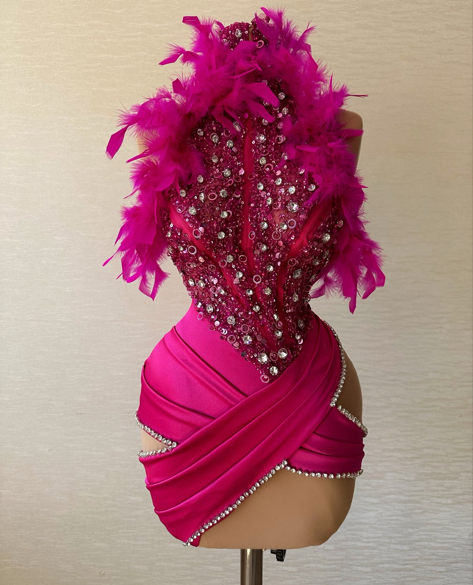 Fuchsia Feather Embellished Mini Dress – Crystal Bodice Dance Costume