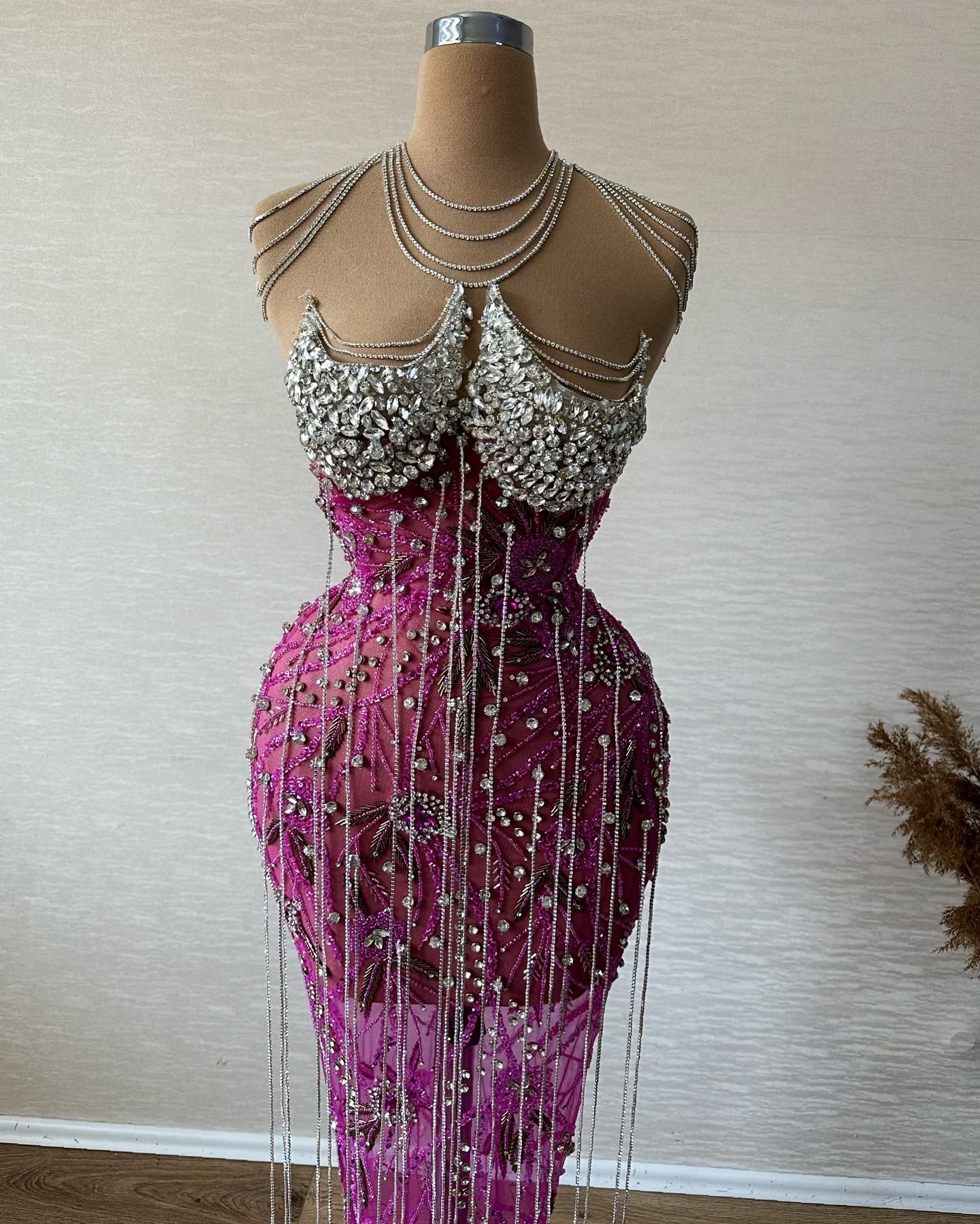 Fuchsia Pink Beaded Body Chain Gown – Crystal Corset Formal Dress