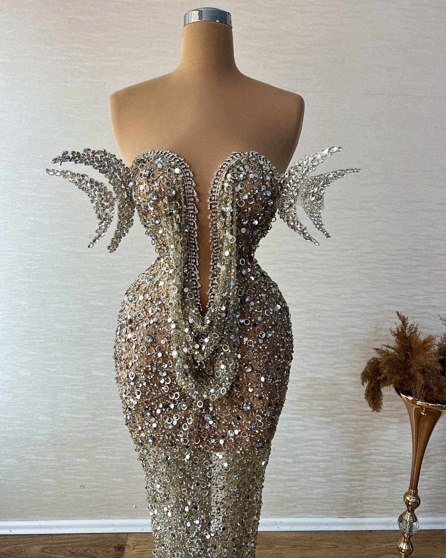 Make a dazzling, unforgettable entrance in this magnificent Gold Crystal Beaded Formal Gown. This dress is entirely covered in thousands of shimmering silver and champagne crystals and sequins, creating a high-shine, liquid metal effect over a nude illusion base. It features a dramatic deep plunge sweetheart neckline enhanced by elegant beaded fringe detailing. The most unique feature is the structured, winged shoulder appliqués that add a couture, architectural look. Perfect for gala events, red carpet appearances, pageants, or the most exclusive black tie parties. Shop this stunning crystal strapless gown for maximum high-fashion impact.