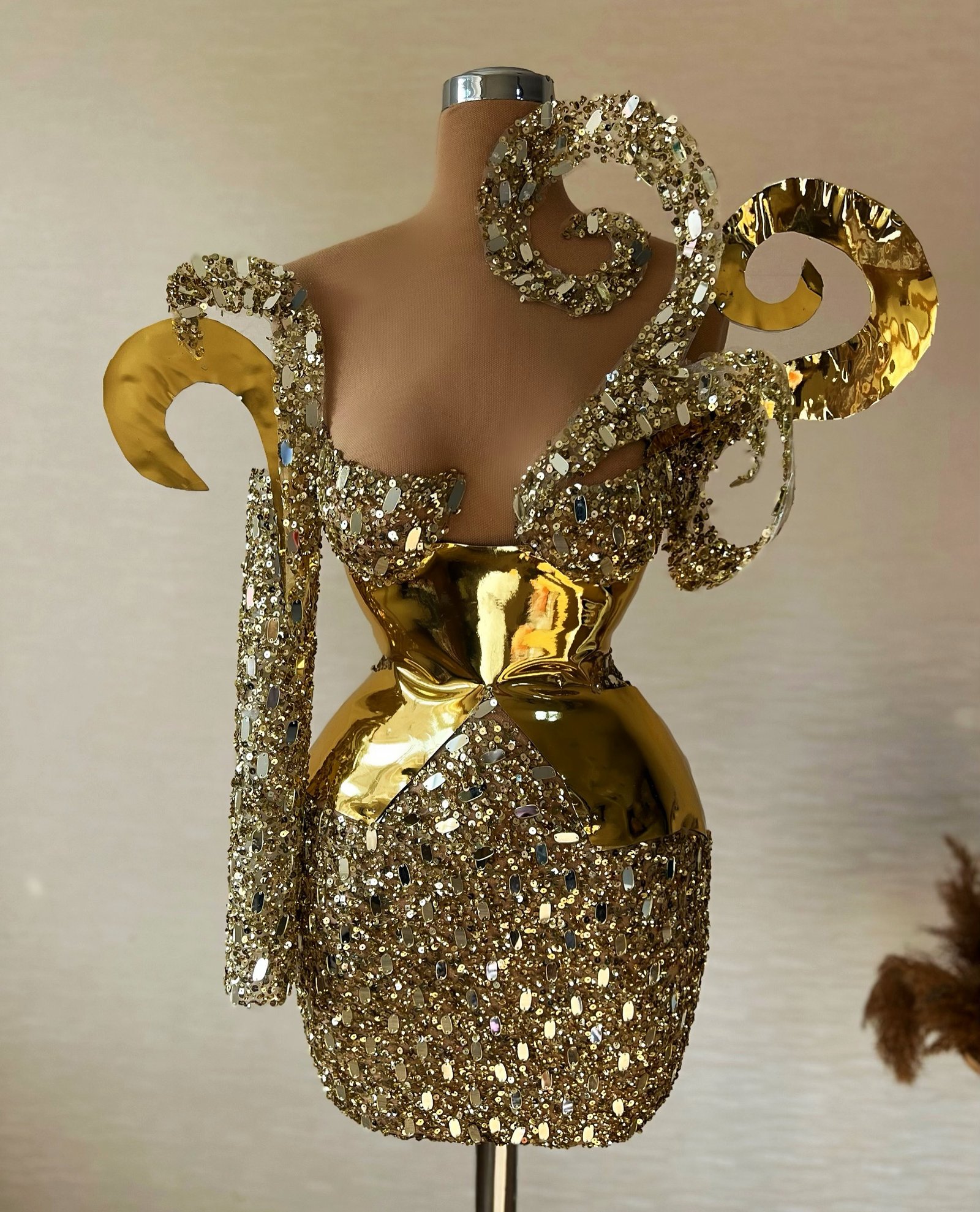 Make a golden statement in this breathtaking Gold Metallic Crystal Mini Dress. This high-fashion short party dress is designed to look like a sculpture, featuring a body-hugging silhouette covered in shimmering gold sequins and mirrored crystals. The dramatic look is completed by highly structured 3D metallic gold appliqués on the shoulders and bodice, reminiscent of wings or horns. The waist is cinched with a metallic gold foil detail. Ideal for exclusive parties, New Year’s Eve, runway events, or performance costumes. Shop this unforgettable gold structural dress for unparalleled couture glamour.