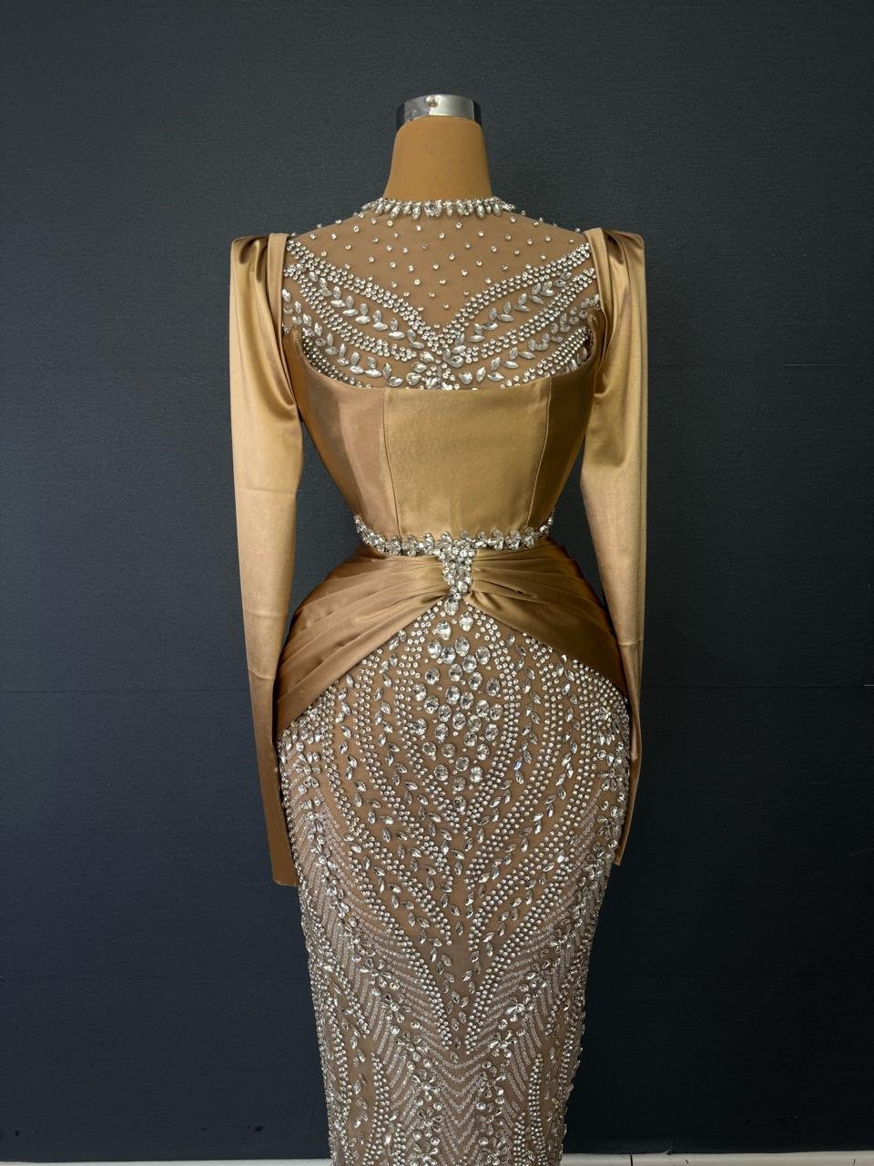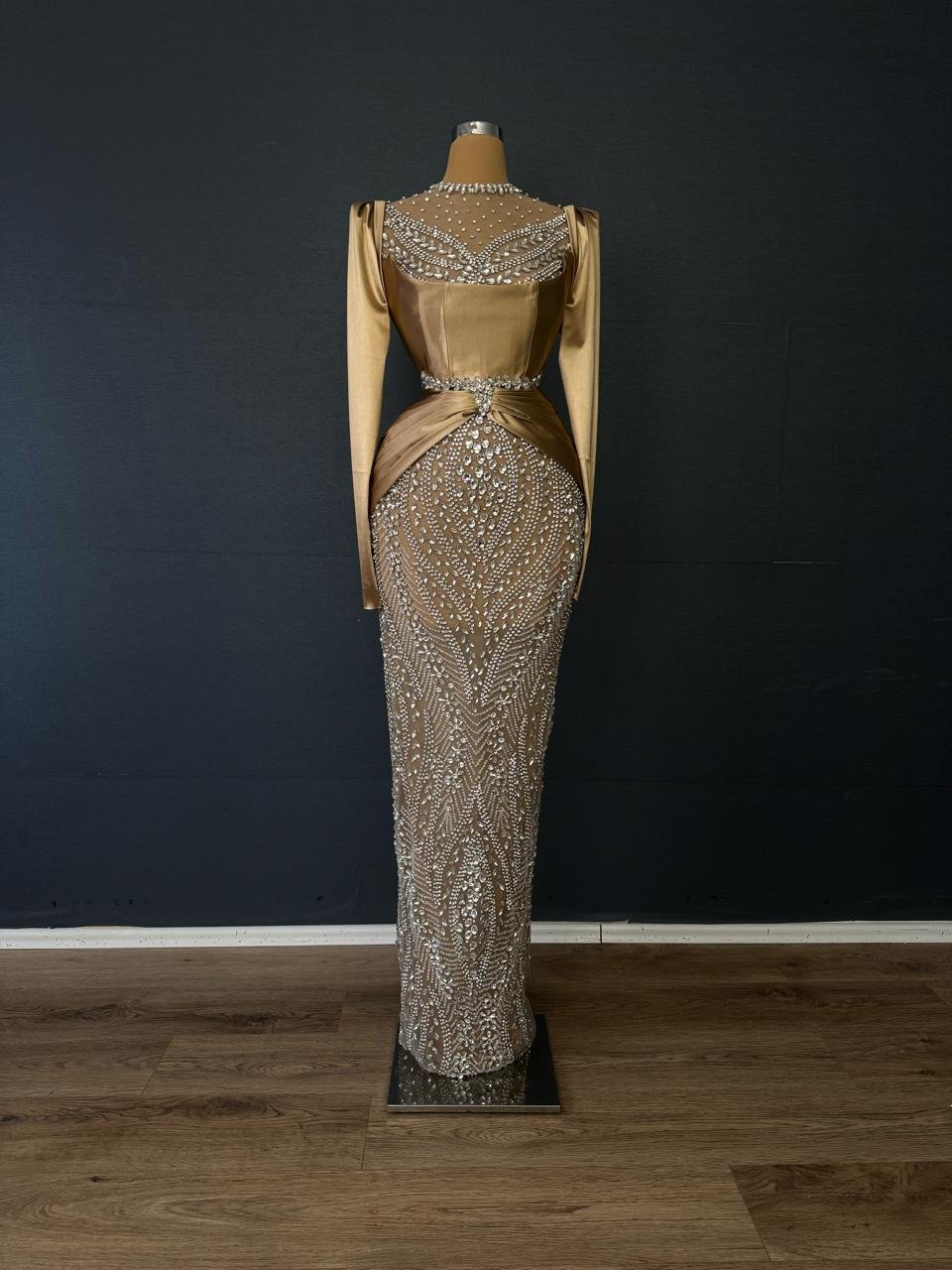 Gold Satin Long Sleeve Formal Dress – Crystal Beaded Illusion Gown