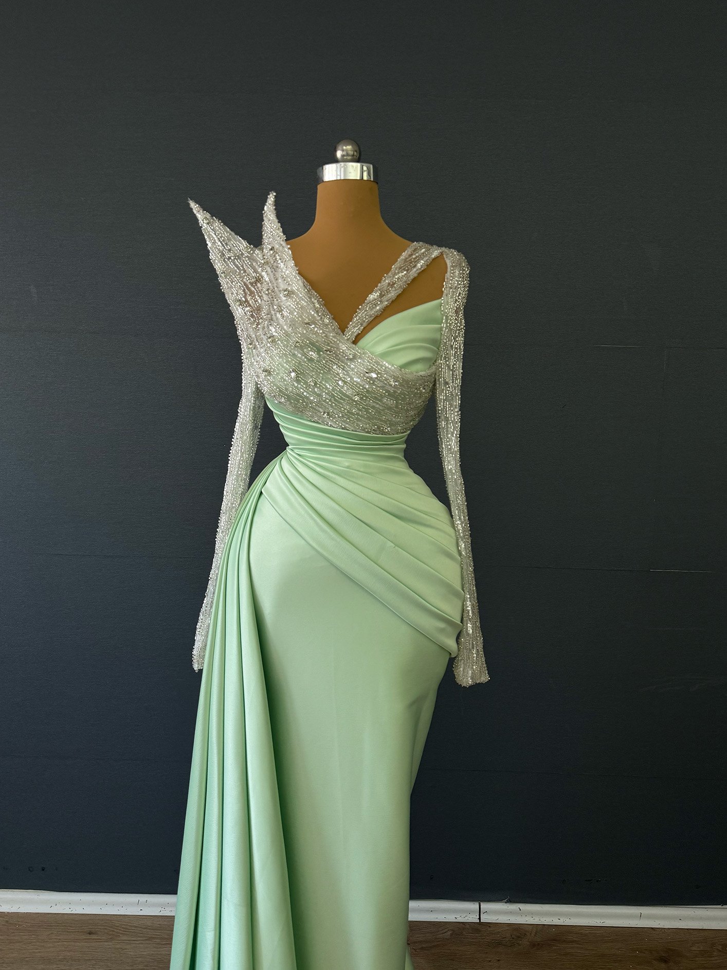 Make a magnificent, fresh entrance in this extraordinary Mint Green Satin Formal Gown. This dress features a fluid, figure-hugging mint green satin skirt with elegant asymmetrical draping at the hip. The bodice is the true focal point, featuring a highly structured, sculptural neckline and matching long sleeves, entirely covered in shimmering silver crystals and beads. The bold design and sophisticated color make this gown perfect for gala events, pageants, destination weddings, or any exclusive special occasion. Shop this breathtaking mint green crystal gown for ultimate couture glamour.