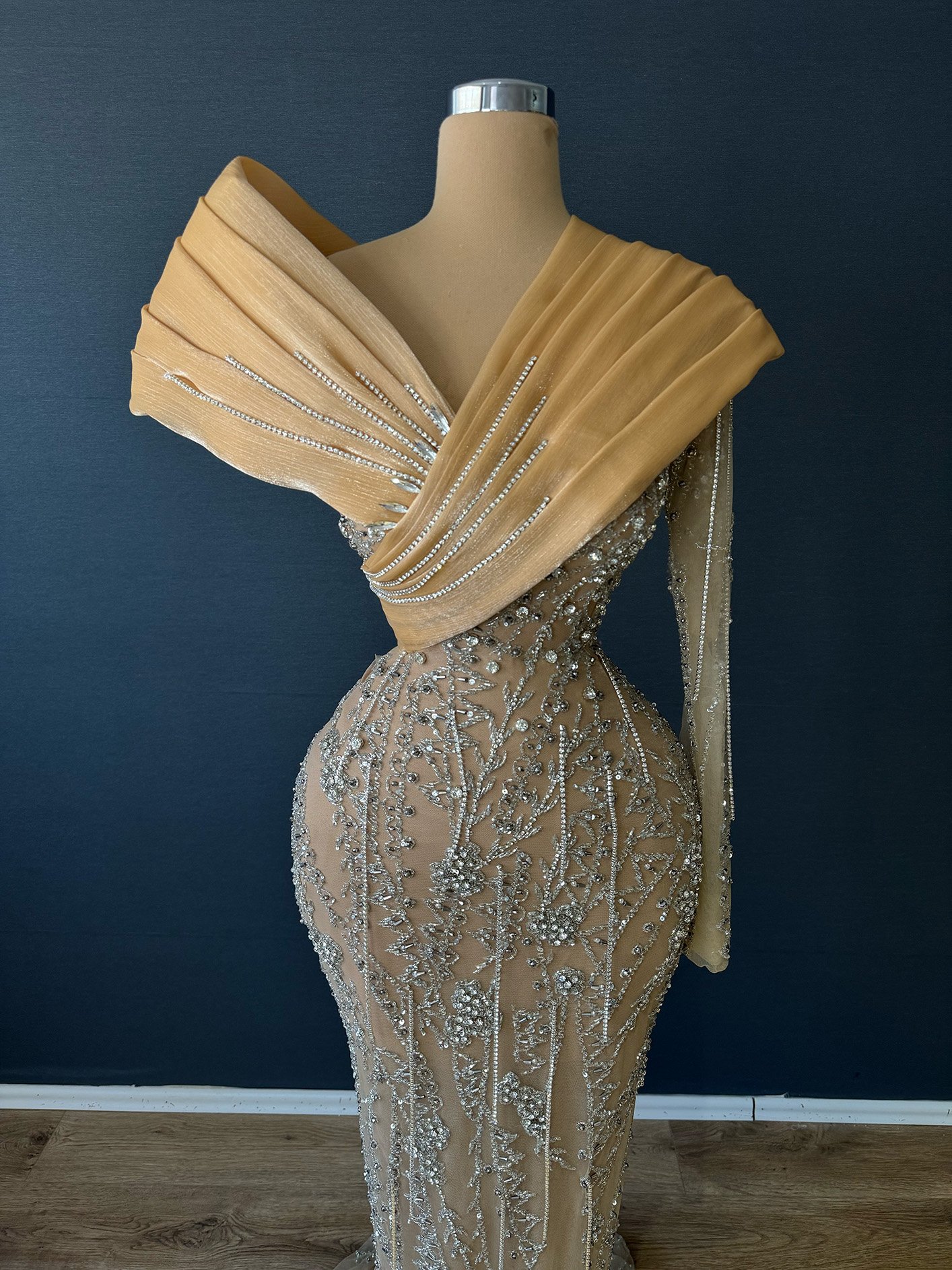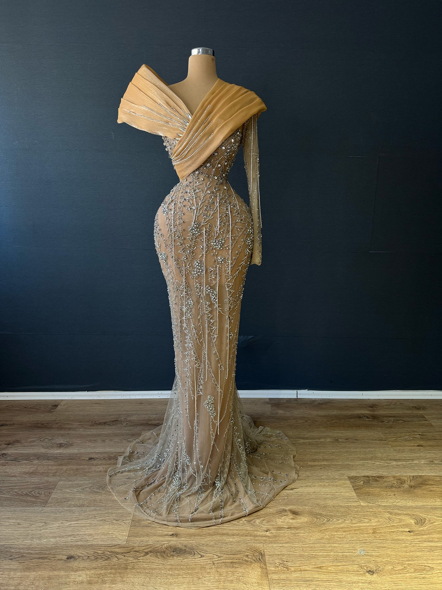Nude Gold Beaded Illusion Formal Gown – Off-the-Shoulder Drape Dress