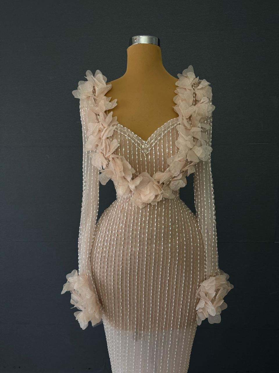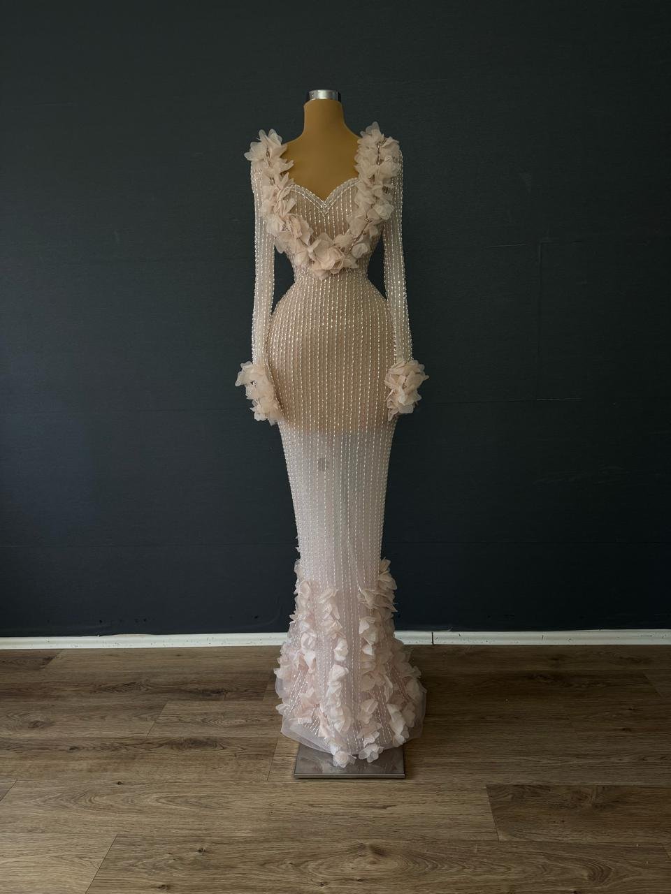 Step into a fairytale with this exquisite Nude Pink Beaded Formal Gown. This dress features a nude illusion base fully covered in vertical strands of shimmering white and pale pink beads, creating a fluid, dazzling effect. The design is beautifully enhanced by delicate 3D floral appliqués surrounding the sweetheart neckline and adorning the cuffs of the fitted long sleeves. The figure-hugging silhouette is perfect for elegant occasions. Ideal for bridal receptions, gala events, pageants, or any sophisticated special occasion. Shop this breathtaking 3D flower long sleeve gown for ultimate romance and glamour.