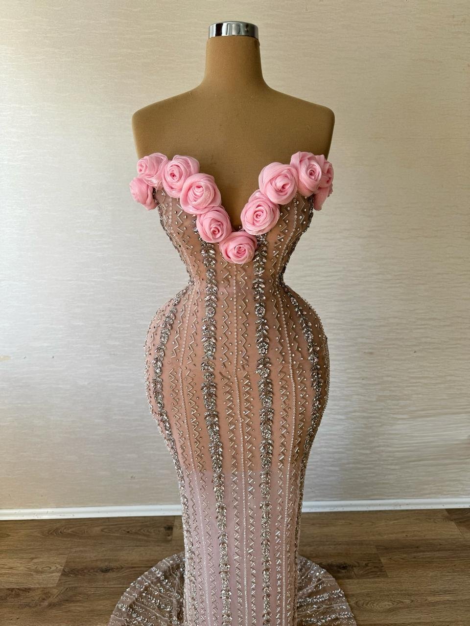 Pink Beaded Mermaid Gown – 3D Rose Flower Sweetheart Neckline