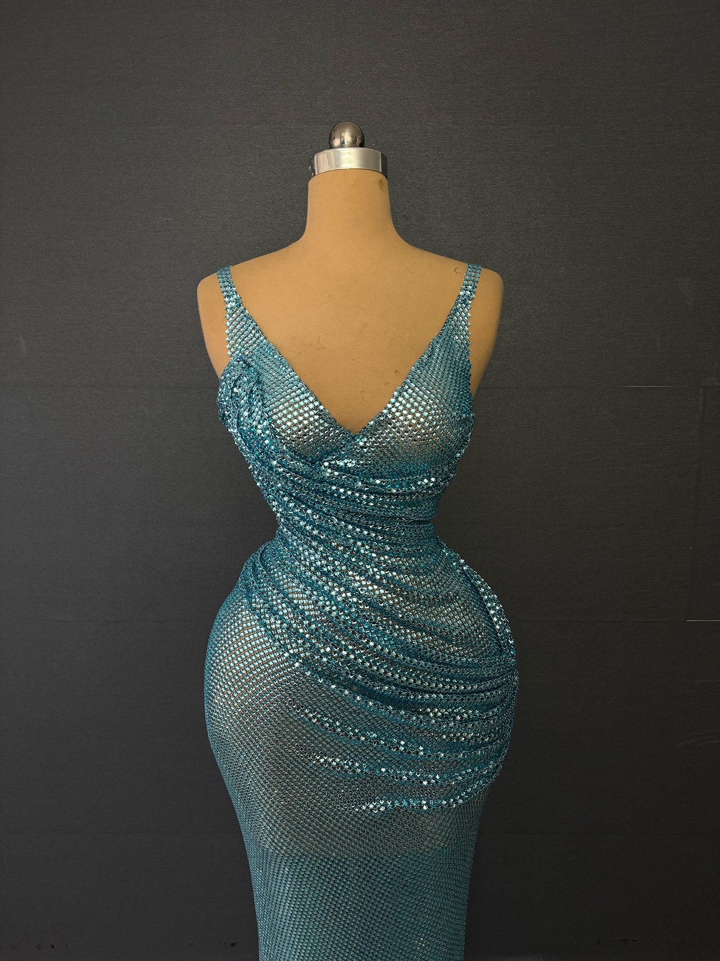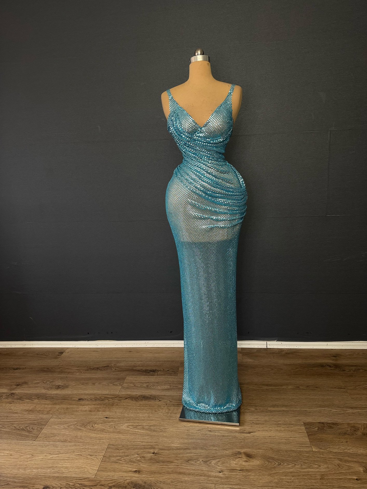 Make a magnificent, shimmering entrance in this extraordinary Sky Blue Sequin Mesh Gown. This figure-hugging dress is crafted from a continuous light blue sequin/rhinestone mesh that drapes over a nude lining, creating a mesmerizing liquid effect. The top features a flattering ruched cowl neckline and delicate spaghetti straps. The elegant draping across the waist sculpts the figure, flowing into a sleek, floor-length column silhouette. Perfect for gala events, New Year’s Eve, high-end parties, or any special occasion demanding bold, metallic glamour. Shop this stunning blue shimmer dress.