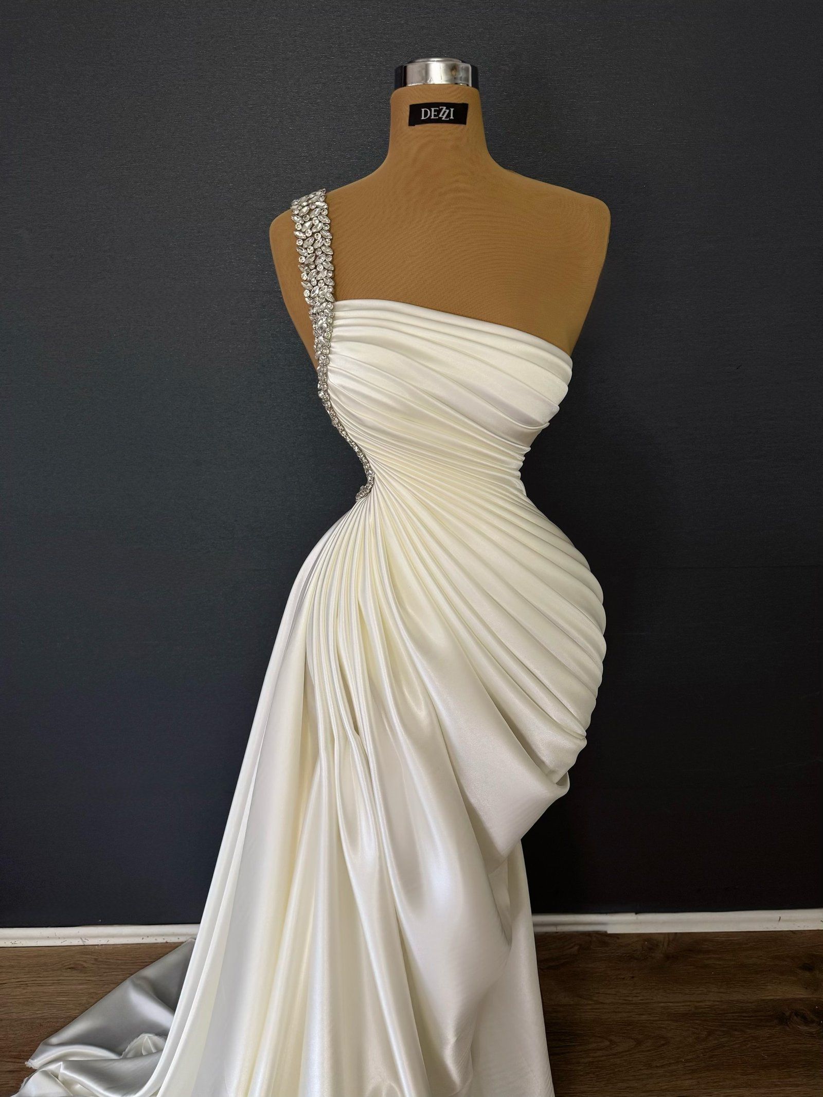 Embody goddess-like luxury in the breathtaking White Draped One-Shoulder Satin Gown. This dress showcases masterful tailoring with its entire silhouette crafted from rich bridal satin, meticulously ruched and draped to create a stunning, sculpted hourglass figure. The asymmetric design features an elegant strapless neckline on one side, countered by a single, glittering crystal-encrusted shoulder strap that flows down the back. The skirt drapes beautifully into a graceful train. Ideal for the modern bride, high-end reception dress, or spectacular gala event. Shop this structural draped satin formal dress.
