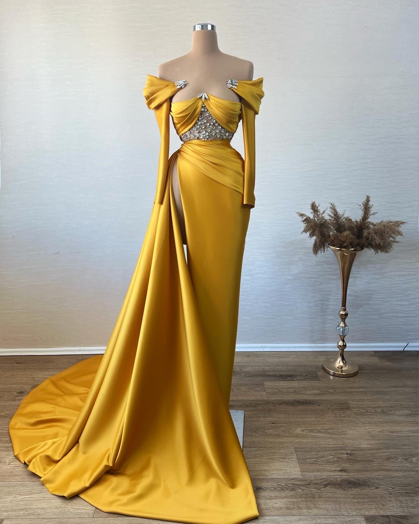 Command the spotlight in this breathtaking Yellow Satin Formal Gown. This radiant dress features an elegant off-the-shoulder neckline with subtle structure and delicate crystal embellishments at the sweetheart bust. The luxurious golden yellow satin drapes beautifully into a fitted silhouette, which is dramatically enhanced by a soaring high thigh slit and a sweeping, attached train. Finished with elegant long sleeves, this gown is perfect for gala events, red carpet appearances, prom, or sophisticated special occasions. Shop this stunning yellow high-slit dress for unparalleled glamour.